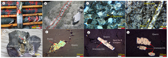 Morphology and mineral assemblages of the surrounding rocks, ore body and gold-bearing ore. (a) Quartz vein in the sandy-slate; (b) Gold-bearing Quartz vein in the tuffaceous slate; (c) Quartz and plagioclase in the sandy-slate; (d) Quartz veinlet in the tuffaceous slate; (e) Quartz, native gold, pyrite and arsenopyrite in the tuffaceous slate; (f) Pyrite in the quartz vein showing the location of the in situ sulfur isotopic analyses; (g) Clintheriform arsenopyrite in the quartz vein showing the spots of the in situ sulfur isotopic analyses; and, (h) Euhedral arsenopyrite in the quartz vein showing the spots of the in situ sulfur isotopic analyses.