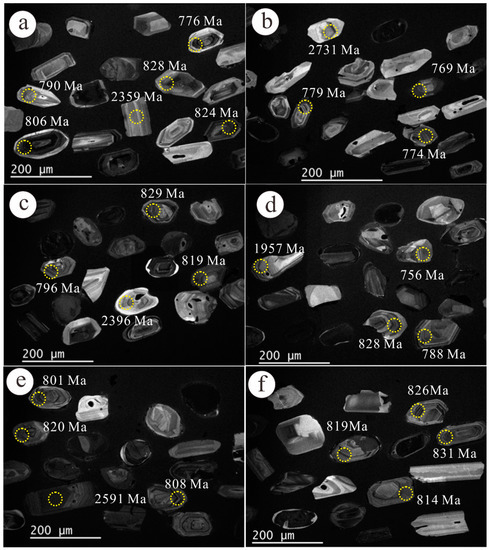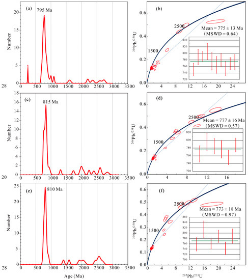 Twenty-nine zircon grains from the tuffaceous slate were selected for the LA-ICP-MS U–Pb dating, and most of these selected zircon grains have internal oscillatory zoning, indicating a magmatic origin (Figure 5a,b, [41]). In addition, these zircon grains have Th and U contents of 160–3728 ppm and 126–3754 ppm, respectively, with Th/U ratios of 0.43–1.77. Most of the analyses are concordant, yielding the zircon U–Pb ages of 2731–246 Ma, with a major peak of 795 Ma (Figure 6a). Ten spots of zircon grains have youngest ages of 751–806 Ma, yielding a weighted mean age of 775 ± 13 Ma (MSWD = 0.64, Figure 6b).