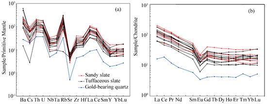 (a) Primitive mantle- and (b) chondrite-normalized patterns of samples from the Chaoyangzhai gold deposit. (a) and (b) are modified from [42,43], respectively.