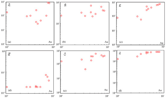 Geochemical plots of Au versus other ore-forming elements. All of the elements are given in ppm.
