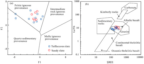 (a) F1 vs. F2 and (b) ΣREE vs. La/Yb plots for the rocks of Qingshuijiang Formation. Figure 9a,b are modified from [49] and [50], respectively. F1 = −1.173TiO2 + 0.607Al2O3 + 0.76TFe2O3 − 1.5MgO + 0.616CaO + 0.509Na2O − 1.224K2O − 9.09; F2 = 0.445TiO2 + 0.07Al2O3 − 0.25TFe2O3 − 1.142MgO + 0.438CaO + 1.475Na2O + 1.426K2O − 6.861.
