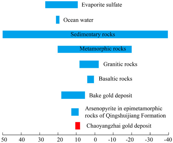 Sulfur isotopic compositions of the Chaoyangzhai gold deposit, showing some important sulfur reservoirs (modified from [59]). The sulfur isotopic data of arsenopyrite in epimetamorphic rocks of Qingshuijiang Formation and Bake deposit are from [8].