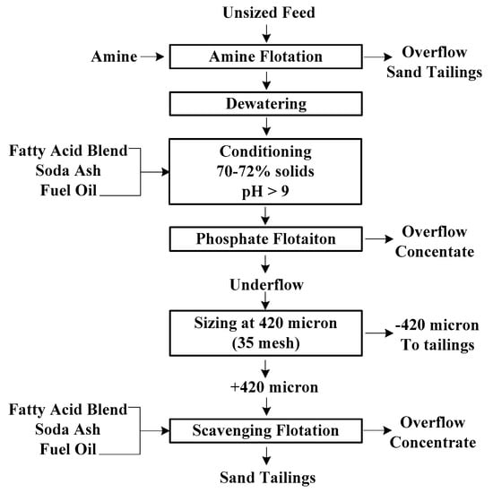 - Zhang, P.; Yu, Y.; Bogan, M. Challenging the “Crago” double float process Ⅱ. Amine-fatty acid flotation of siliceous phosphates. Miner. Eng. 1997, 10, 983–994. [Google Scholar] [CrossRef]