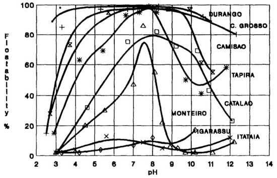 - Silva, J.P.P.; Baltar, C.A.M.; Gonzaga, R.S.G.; Peres, A.E.C.; Leite, J.Y.P. Identification of sodium silicate species used as flotation depressants. Min. Met. Process. 2012, 29, 207–210. [Google Scholar] [CrossRef]