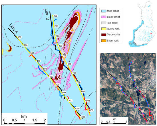 The bedrock of the Outokumpu region is dominantly mica schist that has some black schist intercalations. The massive sulfide deposits are associated with variably sized fragments and lenses of serpentinized mantle peridotites that have been tectonically emplaced upon and within the younger sediments [13]. The Kylylahti massive sulfide deposit is located at the margin of an ultramafic massif and mineralization is confined within the S–N trending eastern limb of the massif. In the Outokumpu district, Cu–Co–Zn–Ni–Ag–Au deposits are hosted by the so called Outokumpu assemblage rocks. This assemblage typically includes serpentinite, talc-carbonate rock, skarn, and quartz rock. This rock sequence is seismically reflective internally and especially against the mica schists motivating attempts to map the ore-hosting lithologies at depth using the seismic reflection method [14,15,16]. In the Outokumpu area, as well as in Kylylahti, the ultramafic massif is enveloped by carbonate–skarn–quartz rocks that in turn are surrounded by sulfide bearing black schist [17]. According to Rekola and Hattula [11], the Outokumpu assemblage rocks form a 3.3 km long and 400 m wide synform in the Kylylahti area. The synform dips at approximately 80° towards the west and the synform axis plunge is 33° towards south. The main mineralization consists of various separate lenses in the eastern limb of the synform.