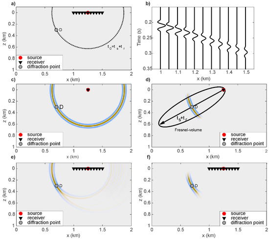 Principle of standard Kirchhoff prestack depth migration (KPreSDM) and Fresnel Volume Migration (FVM): (a) Model consisting of one diffraction point D embedded in a medium with a homogeneous velocity of 5000 m/s. (b) Synthetic shot gather for the source and 11 receivers in (a). (c) KPreSDM and (d) FVM images for a single receiver located at the source. The Fresnel volume is defined for a direct ray path starting from the receiver and propagated into the subsurface up to the two-way travel time of the corresponding time sample to be migrated (e) KPreSDM and (f) FVM images for all 11 receivers.