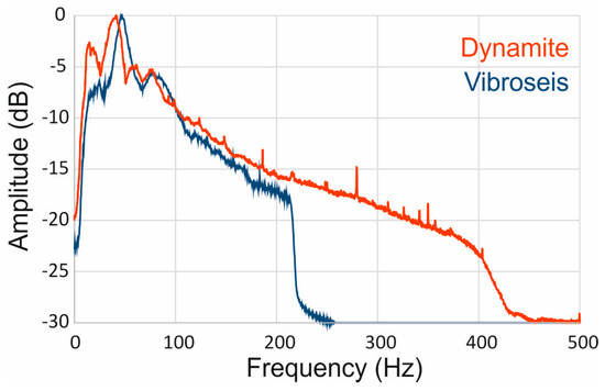 Figure 3 shows Vibroseis and dynamite shot gather acquired at the same surface location before and after the processing described above. Both gathers are of good quality as demonstrated by the clear first breaks along the whole ~6 km long geophone spread and also by some reflections, e.g., at 600 ms. Figure 4 shows the frequency spectrum of the dynamite and Vibroseis shot gathers shown in Figure 3. As expected, the dynamite shot gather exhibits a higher frequency content, up to 420 Hz compared to the Vibroseis record. In the raw shot gathers, the reflectivity is mostly masked by the low-frequency surface waves which were effectively suppressed by band-pass filtering and a median filter. Reflections are imaged most clearly in the frequency band from 50 to 100 Hz, but the frequencies over 100 Hz also contain energy related to reflections as is seen in Figure 5. Surface wave noise is more prominent in the dynamite data while in the Vibroseis records noise is suppressed by the source array.