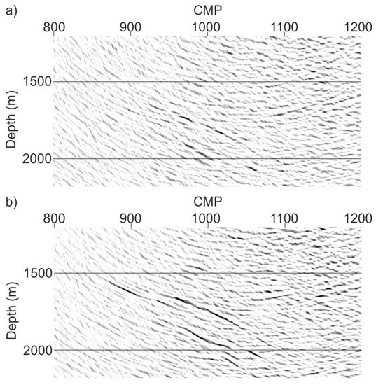Example of a reflector in the post-stack time migrated seismic section with no refraction static corrections (a) and with static corrections applied (b). Influence of static corrections to imaging the reflector is significant.