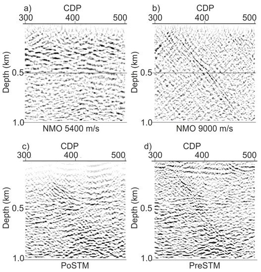 In the next steps, we attempted a Kirchhoff PreSTM using the same second pass velocities as in NMO-corrections of the PoSTM processing. We did not perform post-migration velocity analysis. Imaging of the reflectivity down to ~1 km depth, which is of interest for exploration, was the most challenging issue. The source-generated noise masks shallow reflections independent of the source type, and additionally, near surface geological interfaces are subvertical and thus not ideal for surface seismic imaging. In the PreSTM results, a fairly steep reflector was observed reaching the surface at CMP 330. This is only observed in the NMO stacked data if unrealistically high stacking velocities are used for NMO corrections (Figure 8). Juhlin et al. [24] report a situation where dip moveout (DMO) corrections fail to produce a clear seismic image while use of high NMO velocity allows imaging of the steep dips. Also in the case of Kylylahti data, NMO velocity of 9000 m/s followed by the constant velocity Stolt migration enables the imaging of the same reflector as is seen in the PreSTM section. Later the efforts put on DMO parameterization paid off by making these steep reflectors visible in the final PoSTM sections without compromising imaging of the reflectors with more subtle dip and by using velocities corresponding to real rock properties. We used the time-domain Kirchhoff integral-based DMO on common-offset planes with the NMO velocities from the second pass of velocity analysis.