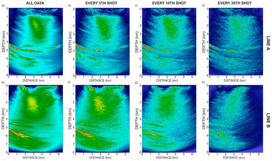 The PreSTM results with a limited number of shot gathers could not image reflections when every 5th source gather was stacked, and these results are not discussed further. However, the FVM results of the same data show that meaningful results could have been achieved with very sparse source spacing. In Figure 10, seismic data are stacked before FVM by using all, every 5th, every 10th and every 20th shot gather. The resolution of the images clearly decreases with the decreasing number of sources but only about 20 source points along the whole 6 km long profile appear to image a substantial part of the reflectivity observed in the full stacks. Logically, the near-surface reflectivity deteriorates because of lack of data while deep strong reflectors are imaged with only 12– 13 source points. The COGITO-MIN project also investigated the imaging power of sparse active seismic sources in the 3D layout as a side product of a passive seismic survey [25].