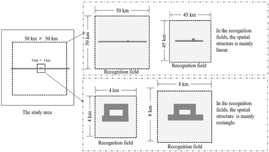 Both the background spatial structure and anomaly spatial structure can be found for a certain element. They have different recognition domains (Figure 2). Generally, background recognition domains are larger than anomaly recognition domains. In the background recognition domains, the spatial structure is stable, meaning the structure does not change greatly with the increase of recognition domain. For example, as shown in Figure 2, as the domain increases from 45 km × 45 km to 50 km × 50 km, the spatial structure still shows a linear pattern. On the other hand, the anomaly shows the opposite behavior and the spatial structure changes greatly with the increase of the recognition domain.