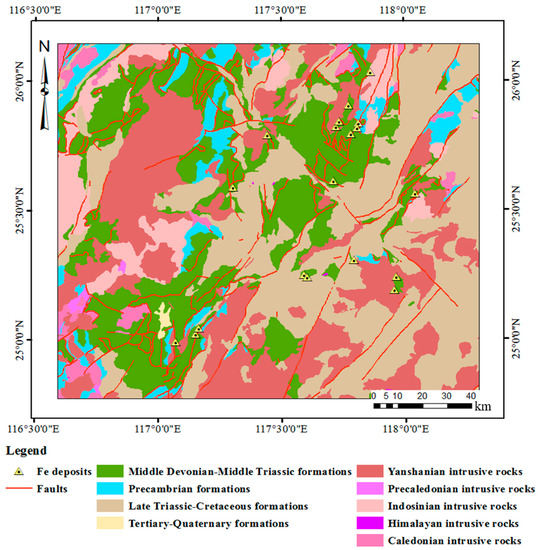 To assess its performance for geochemical anomaly recognition, the proposed MCAE approach was applied to the Fe metallogenic belt located in the southwest Fujian depression center. This region is characterized by large areas of Paleozoic stratigraphy and intermediate acidic magmatic rocks from the Yanshan period that provide a material base and metallogenic environment for the formation of iron, copper, and zinc polymetallic ore deposits [58,59]. Several skarn-type Fe deposits have been found in this area (Figure 6).