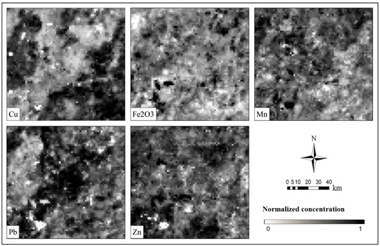 To examine the performance of MCAE, the stream sediment geochemical dataset at a scale of 1:200,000 collected at 2 km × 2 km grids in a regional geochemical survey as part of the Chinese National Geochemical Mapping (CNGM) project [60] was used in the experiment. The dataset includes 39 content values for each sample. Previous studies have indicated that Cu, Mn, Pb, Zn, and Fe2O3 are most strongly related to the Fe deposits in the region [61,62], and therefore, their concentration values were used for the anomaly recognition experiment. All of the concentration values were transformed into the range of [0, 1] using min–max normalization, as shown in Figure 7. Figure 7 shows that the spatial distribution of the five elements presents a certain regularity. The distribution of geochemical elements in hypergenic media is the result of the superposition of many complex geological processes [63]. The spatial regularity of the elements is due to the combination of the changes of the main geological action, while the secondary geological action is manifested by the randomness of the elements [64].