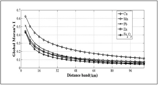Global Moran’s I values were calculated with Equation (3) using ESRI@ ArcGIS software. The function of distance was defined using inverse distance weighting (IDW) based on the Euclidian distance. Distance bands were used for distinguishing between “close” and “not so close” locations. The “not so close” elements were ignored when calculating the Moran’s I value. To determine the background recognition domains of Cu-Fe2O3-Mn-Pb-Zn in the study area, we calculated the global Moran’s I values in different distance bands.