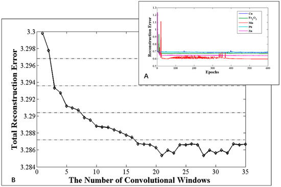 Figure 9. (A) Variation in the reconstruction error with the number of training epochs. (B) Variation in the total reconstruction error with different numbers of convolution windows.