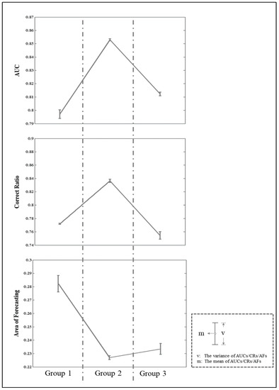 Figure 12. Average–Variance bars of forecasting area (AF), correct ratio (CR), AUC for Groups 1–3.