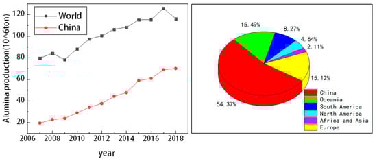 Global data from the International Aluminium Institute regarding annual alumina production worldwide and in China. Regional distribution of alumina production in 2017 [,,,]. Reproduced with permission from [], published by Elsevier B.V., 2016.