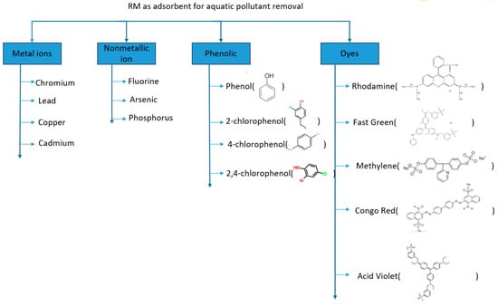 Increased industrial and agricultural activities result in the production of various toxic pollutants, which are the major cause of water pollution worldwide. The types of contaminants in wastewater are mainly determined by the nature of the industry. However, the pollutants commonly found in wastewater are metal and non-metal ions, phenols, and various dyes. The pollutants in wastewater are toxic to aquatic organisms and may cause natural water to be unsuitable for drinking and growing crops. Various methods, such as coagulation, foam flotation, filtration, ion exchange, aerobic and anaerobic treatment, advanced oxidation process, solvent extraction, adsorption, electrolysis, microbial reduction, and activated sludge, have been employed in wastewater treatment []. Compared with the more conventional methods, flotation offers several advantages, such as higher metal selectivity, higher removal efficiency, higher over flow rates, lower detention periods, lower operating cost, and production of more concentrated sludge []. However, the disadvantages of flotation include high initial capital cost and high maintenance and operation costs Electrochemical technology for heavy metal removal from wastewater is a rapid and well-controlled method that requires few chemicals, provides good reduction yields, and produces less sludge. However, the development of electrochemical technologies is restricted by their high initial capital investment and expensive electricity supply. Membrane filtration can remove heavy metal ions with high efficiency, but its high cost, process complexity, membrane fouling, and low permeate flux limit its use in heavy metal removal []. The sludge produced when using coagulation flocculation to remove heavy metals from wastewater features good settling and dewatering characteristics []. However, this method involves chemical consumption and increased sludge volume generation. In a word, these technologies demonstrate evident shortcomings, including inadequate removal of pollutants [], high capital costs [], considerable reagents or energy requirements [], and generation of toxic sludge or other wastes requiring further safe disposal []. Adsorption is a common process in wastewater treatment technologies. RM, a type of industrial waste with low cost and strong adsorption, is used to treat wastewater discharged by various industries and could provide substantial advantages for environmental pollution control. RM can be used as an adsorbent to remove different pollutants from wastewater, as shown in Figure 2. Prior to water treatment, RM should be first activated by acidification, thermal activation, and synthesis to prevent secondary pollution to water and enhance its adsorption capacity [].