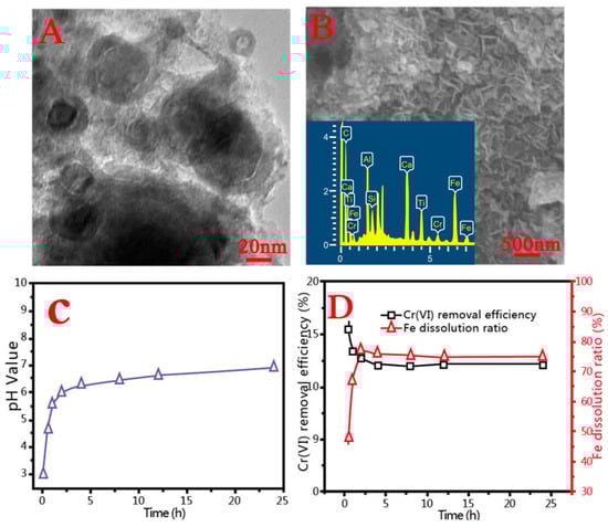 TEM (A) and SEM-EDS (B) images of the spent RM/carbon sample; pH and time during the removal process of Cr6+ over RM/carbon at the initial pH of 3.0 (C); and removal efficiency of Cr6+ and dissolution rate of Fe over RM/carbon at the constant pH of 3.0 (D) [,]. Reproduced with permission from [], published by Elsevier B.V., 2018.