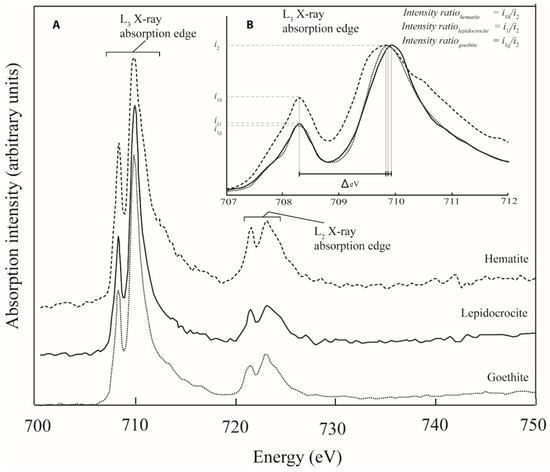 (A) The Fe L2,3 X-ray Absorption Near-Edge Structure (XANES) spectrum for three standard iron oxide minerals (goethite (α-FeOOH); lepidocrocite (γ-FeOOH); and hematite (α-Fe2O3)) clearly illustrating the peak splitting that occurs in both the L2-edge and the L3-edge on account of ligand field splittingeffects. (B) The fine structure of the L3-edge region of the spectrum (i.e., the degree of L3-edge peak splitting (ΔeV) and the intensity ratio (i) between the split peaks) reflects the differences in chemistry and mineralogy of the three minerals. These differences can be quantified and represent a useful tool for Fe nanoparticle characterisation (e.g., Figure 2; Reference [15]).