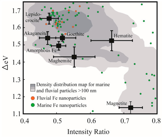 Plot of the spectral parameters ΔeV versus intensity ratio clearly illustrating the discrete fields occupied by synthetic Fe mineral standards (black squares and associated bars representing standard deviation (modified after Reference [15])). Colored point data represent the spectral signatures for individual Fe nanoparticles from fluvial (orange) and marine (green) systems, whereas the shaded region represents the density distribution of data points for sub-micrometer (larger than 100 nm) and micrometer sized particles collected from marine and fluvial environments (generated using ArcGIS point density function).
