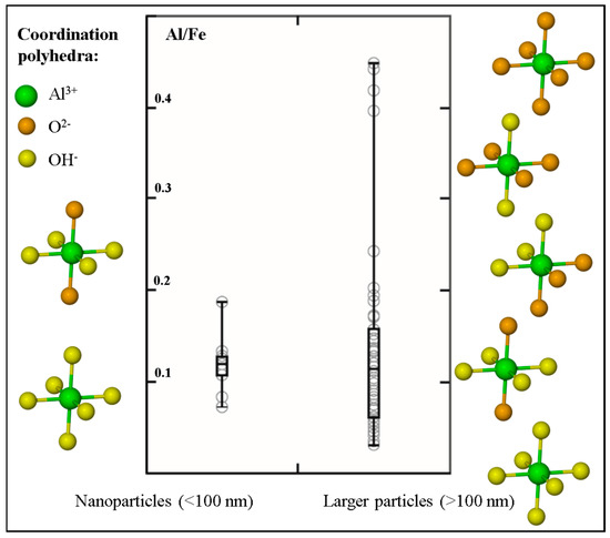 Box-and-whisker diagram comparing the Al/Fe ratio measured in nanoparticles versus the range measured in larger sub-micrometer (>100 nm) and micrometer sized particles (data extracted from [34]). Side panels show the diversity in the number of hydroxyl ligands coordinated to the Al metal centers in the two size fractions (from interpretations of Al K-edge XANES [34,52]; ligand positions are not absolute). These side panels highlight that hydroxyl ligands predominate over oxygen ligands in the Fe-rich nanoparticles, whereas larger-sized natural Fe particles are characterized by a prevalence of both oxygen and hydroxyl ligand bonding.