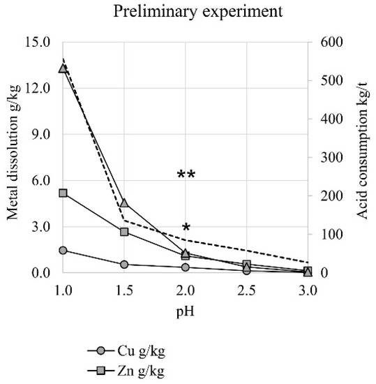 Leaching of the MSWI BA sample material in different pH values in shake flasks (pH 1.0–pH 3.0; symbols “*” and “**” illustrate copper dissolution when Fe3+ concentration was 5.3 and 8.4 g/L, respectively). Acid consumption expressed as kg 95% H2SO4 per ton of sample material.