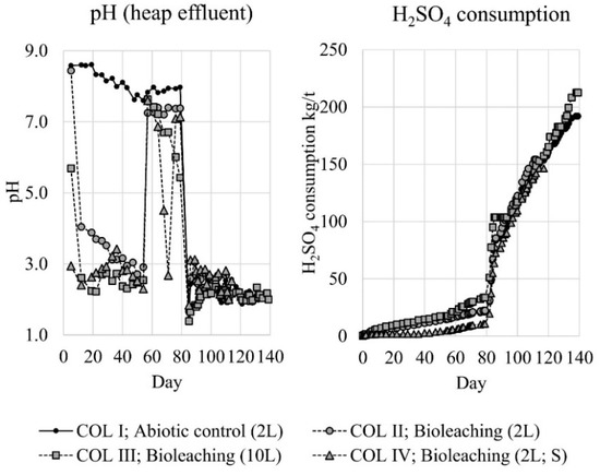 The pH of the column effluents, and cumulative H2SO4 consumption (kg pure acid per ton of sample material) during the experiments (H2SO4 used to maintain pH of the circulation tank at desired value). Circulation tank volume presented in parentheses; symbol “S” illustrates the column supplemented with elemental sulfur.