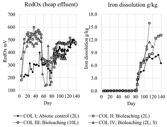 After the loss of two inoculated columns, a final flooding test was done for the remaining columns (COL I and COL III) by adding aeration to the circulation tanks on day 119. Simultaneously, the influent flow rate was decreased back to 5 L/m2·h, and the inoculated column COL III was re-inoculated to secure the presence of active iron oxidizing bacteria. These changes did not have remarkable effects on the pH or acid consumption (Figure 2: days 119–139). The RedOx-potential remained stable with the inoculated column COL III, but increased with the abiotic column COL I, so that both operative columns reached +500 mV level (Figure 3: days 119–139). During the aeration, iron and zinc dissolution tended to level off. However, copper dissolution intensified clearly in both columns (Figure 3 and Figure 4: days 119–139).
