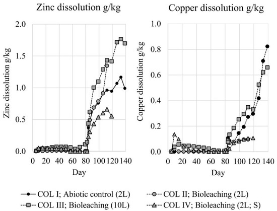 Zinc and copper dissolution from sample material (grams of dissolved iron per kg of sample material) in column experiments. Circulation tank volume presented in parentheses; symbol “S” illustrates the column supplemented with elemental sulfur.
