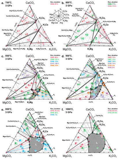 At 950 °C (runs D116, 30 min; D118, 40 h; and D145, 1 h), the diagram contains two subsolidus three-phase fields Mg-Cal + K2Ca3 + K2Ca2 (Figure 4a) and Arg + K2Ca3 + Mg-Cal. The latter is inferred from phase relations established in the CaCO3–MgCO3 and K2CO3–CaCO3 binaries [42,47] (Figure 6e, Tables S15–S17). The melt field is surrounded by six two-phase fields: Mgs + L (Figure 4b), Dol + L, Ca-Dol + L (Figure 4c), K2Ca2 + L (Figure 4d), K2Ca + L, and K2 + L; and by five three-phase fields: Dol + Mgs + L (Figure 4f), Dol + Ca-Dol + L, Ca-Dol + K2Ca2 + L, K2Ca2 + K2Ca + L, and K2Ca + K2 + L.