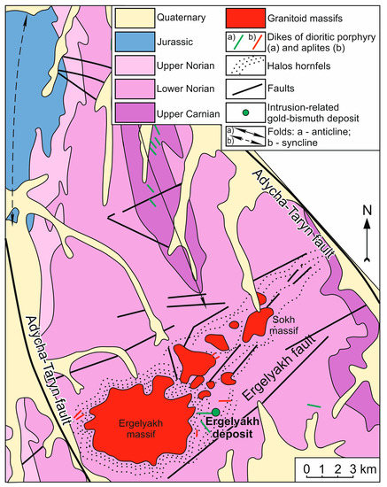 Geologic map of the area of the Ergelyakh and Sokh massifs, including the Ergelyakh intrusion-related gold–bismuth deposit.
