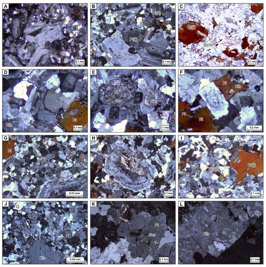 Aplitic granites are made of plagioclase (22–30%), K-feldspar (29–40%), quartz (up to 25%), and biotite (up to 5%). The texture of the rocks is granitic and aplitic (Figure 4J). Plagioclase is unzonal (5–12% An) and partly sericitized (Figure 4K). K-feldspar is partly perthitized and contains inclusions of plagioclase and granular quartz (Figure 4L). Quartz occurs as irregular or rounded grains. Biotite of irregular form is partly chloritized (Figure 4C,D).