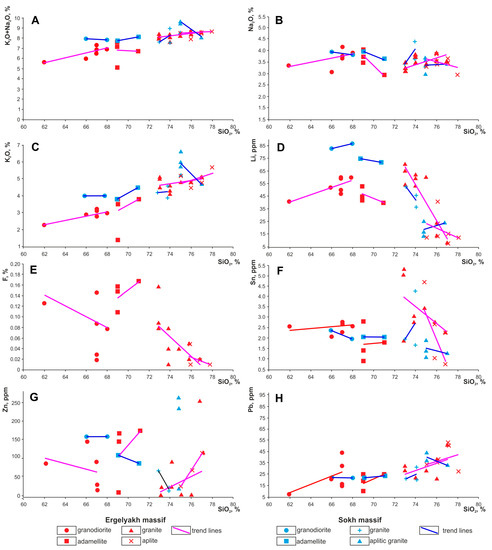 Variation diagrams for granitoids of Ergelyakh and Sokh massifs: (A) K2O + Na2O–SiO2; (B) Na2O–SiO2; (C) K2O–SiO2; (D) F–SiO2; (E) Li–SiO2; (F) Sn–SiO2; (G) Zn–SiO2; (H) Pb–SiO2.