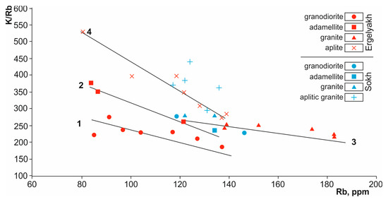 Rb–K/Rb diagram for granitoids of Ergelyakh and Sokh massifs. 1–4—trend lines for granitoids: 1—granodiorite, 2—adamellites, 3—granites, 4—aplites and aplitic granites.