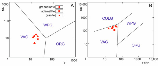 Discrimination (A) Nb–Y and (B) Rb–(Y + Nb) diagrams for Ergelyakh massif granitoids [56]. WPG, within-plate; VAG, volcanic island area; COLG, collisional; ORG, oceanic ridges.