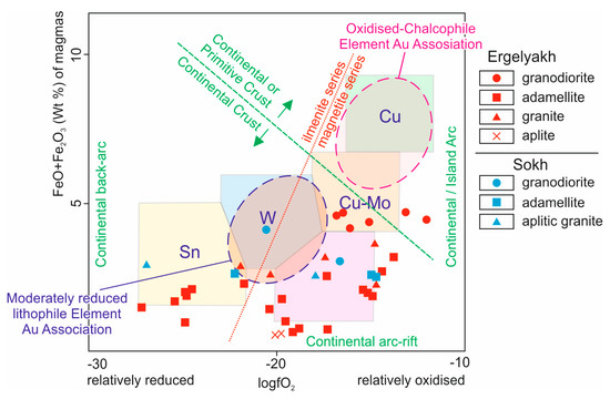 According to [30], the formation of ore occurrences associated with granitoids is controlled by the pressure conditions in the course of their emplacement. Particularly, pressure less than 1 kbar is favorable for the formation of Pb–Zn and Mo mineralization, while pressure of 1–2 kbar is responsible for Cu–Fe and Sn and 2–3 kbar for W occurrences. At pressures exceeding 3 kbar, no mineralization can form. From the Ti–biotite geobarometer data, the EIRGD granitoids were formed within a wide pressure range from 1.67 to 3.4 kbar (Table 12), and thus can be considered promising for certain types of mineralization. Mason [60] believes, however, that granitoids that initially formed at low fO2 values can hardly be prospective of any mineralization, even with subsequently increasing oxygen fugacity. The data we obtained on oxygen fugacity in EIRGD rocks (Table 13) show that at the onset of the Ergelyakh granitoid crystallization, their parent magma was inhomogeneous in terms of oxygen fugacity (ΔNi–NiO from +3.3 to –3.6), becoming more oxidized in the period of biotite formation. Granitoids of the Sokh massif initially formed under reducing conditions (ΔNi–NiO = –8.7 to –2.9 for granitoids, –8.8 to –3.9 for adamellites, –9.3 to –8.2 for granites). On the FeO–Fe2O3-log fO2 diagram (Figure 12), data points for the EIRGD granitoids fall into fields of different mineralization types (Cu–Mo, Mo, W, Sn, and, partly, moderately reduced lithophile element Au association).