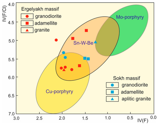 Discrimination diagram of IV(F/Cl)–IV(F) coordinates for biotites from Ergelyakh and Sokh massif granitoids [60].