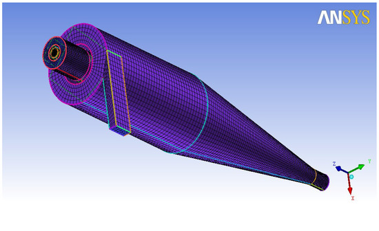 In this work, considering the double-overflow-pipe hydrocyclone as the research object, the fluid dynamics analysis software FLUENT 6.3 is used to simulate the flow field characteristics of the hydrocyclone to study the influence rule of the diameter of the underflow outlet on the velocity field and pressure field. We use the ICEM 14.5 software for structural meshing. The result of the meshing is shown in Figure 2 and the total number of nodes of the entire flow field in the calculation field is 140,577.