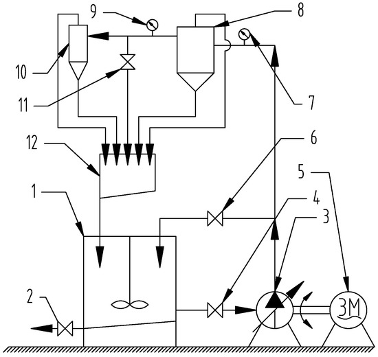 Schematic of the experimental apparatus. 1—Agitator; 2, 4, 6, 11—Valves; 3—Slurry pump; 5—Motor; 7, 9—Pressure gage; 8—I stage hycrocyclone; 10—II stage hydrocyclone; 12—Receiving vat.