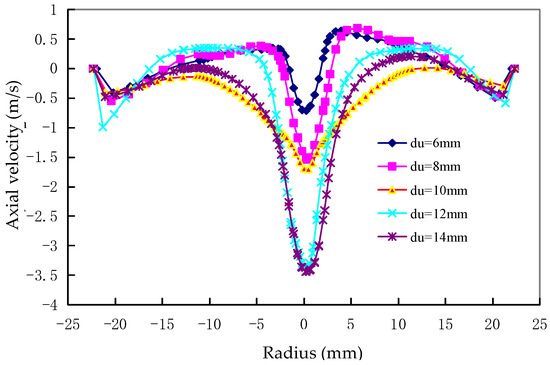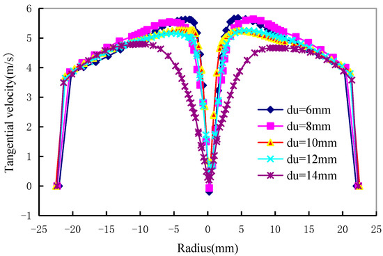 Figure 5 shows the tangential velocity distribution inside the hydrocyclone corresponding to different diameters of the underflow outlet. As shown in Figure 5, we can see that the tangential velocity at the center of the hydrocyclone is very small, and it increases with the radius of the hydrocyclone. When the diameter of the underflow outlet is reduced, the tangential velocity increases. This is because the smaller the diameter of the underflow outlet, the greater the resistance to the downward flow of the fluid and the lower the axial velocity. Therefore, when the feed pressure is kept constant, the tangential velocity is increased. From Figure 5, we can also conclude that the smaller the underflow outlet diameter, the closer the location of the maximum tangential velocity is to the center of the hydrocyclone; therefore, the greater the internal swirl centrifugal force, the better the separation performance and higher the classification accuracy.