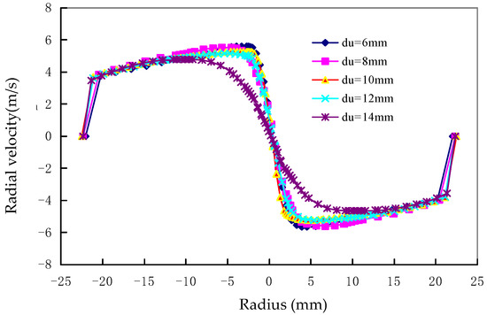 Figure 7 shows the radial velocity distribution inside the hydrocyclone. We can see that the radial velocity of the fluid is the smallest at the wall which is close to zero. As the radius decreases, the absolute value of the radial velocity gradually increases. After reaching the maximum value, it gradually shrinks with the decrease in the radius. This is, in essence, consistent with the conclusion of the research by Ji et al. [39]. The diameter of the underflow outlet has little effect on the radial velocity field, which demonstrates that there is no essential difference between the double-overflow-pipe structure and the traditional single-overflow-pipe structure in terms of the radial velocity distribution.