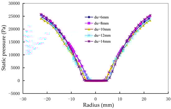 3.1.2. Distribution Characteristics of Pressure Field and Influence of Underflow Outlet Diameter on Pressure Field Performance