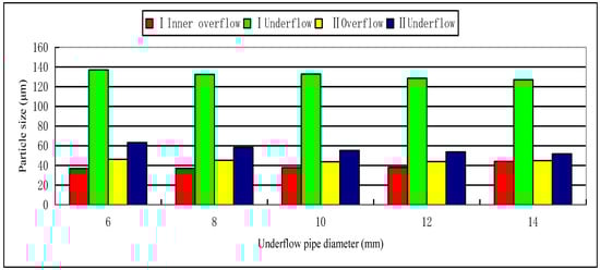 The first stage internal overflow was the finest while the first stage external overflow was the coarsest. The particle size of the second stage overflow was between that of the first stage internal and external overflows. The diameter of the underflow outlet had an opposite influence on the particle size of the first stage internal and external overflows. When the diameter of the underflow outlet increased, the particles of the first stage internal overflow became coarser and the particles of the first stage external overflow became finer.