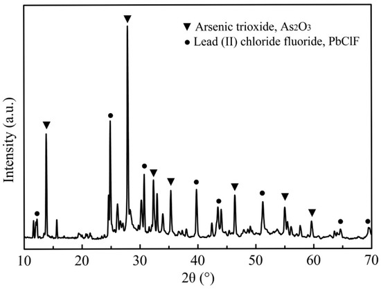 The powder sample of the dust used in this study was obtained from a lead smelter (Hunan, China). The high-arsenic dust (As > 30 wt. %) could not be recirculated back into the smelting system and converting process [22]. The original dust was firstly dried at 100 °C for 24 h in a draught drying cabinet and then crushed, ground and mixed to a homogeneous powder for the preparation of analytical and experimental samples [23,24]. The main chemical composition of the high-arsenic dust is given in Table 1. As can be seen, the high-arsenic dust contained up to 34.2% arsenic and a certain amount of valuable metals, making it essential to remove the arsenic in advance for preventing secondary pollution and recycling resource. The XRD pattern of the sample shown in Figure 1 indicates that the phase of arsenic in the high-arsenic dust was mainly in the form of As2O3. The phase of lead was mainly in the form of lead (II) chloride fluoride (PbClF), and no other apparent mineral phase could be identified in the high-arsenic dust due to the amorphous nature and the relatively low content. The SEM images of the original materials and the chemical composition determined by EDS are presented in Figure 2. It was apparent that the As2O3 existed in cubic crystal and the result of the EDS pattern with the corresponding area in Figure 2d was basically consistent with the results analyzed by XRD.