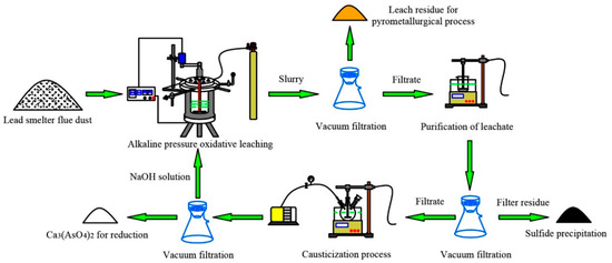 Additionally, with respect to the rich metal elements of lead smelter flue dust, the dust is regarded as a secondary resource, which should be properly disposed of and comprehensively utilized to avoid pollution of the ecological environment and to achieve the maximum economic benefits [11,12]. At present, the methods for the comprehensive utilization of lead smelter flue dust can be divided into pyrometallurgical and hydrometallurgical processes. Pyrometallurgical processes mainly include reduction roasting, volatilization roasting and eliminating arsenic in vacuum, and hydrometallurgical processes mainly include acid leaching and alkaline leaching [13,14]. In pyrometallurgical processes, the removal of the arsenic from the smelter flue dust is mainly carried out by calcination. When the temperature reaches 465 °C or higher, arsenic trioxide (As2O3) in the dust will violently volatilize into the flue gas, while arsenic will be separated from other high boiling point or non-volatile materials. The pyrometallurgical process is relatively simple and widely used. However, due to the low boiling point of As2O3, most arsenic and arsenic oxide can easily evaporate during the pyrometallurgical processes, which results in metal dispersion, high energy consumption and secondary pollution [15]. Compared with pyrometallurgical processes, hydrometallurgical processes are more environmentally friendly and thus gradually become an important research direction for the treatment of smelter flue dust. Arsenic has obvious dispersibility during acid leaching process, which increases the difficulty of separating arsenic from other valuable metal elements in the leachate [16,17]. In contrast, alkaline solution is selective in dissolving arsenic and has a significantly faster leaching rate than acid leaching, which is because arsenic oxides and arsenates are readily soluble in an alkaline medium [18]. For alkaline leaching, sodium hydroxide (NaOH) or sodium hydroxide-sodium sulfide (NaOH and Na2S) is usually employed as the leaching agent.