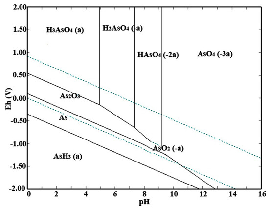 Eh–pH diagrams show the thermodynamic stability areas of different species in an aqueous solution. Stability areas are presented as a function of pH and electrochemical potential scales. In the present study, the As–H2O system was used as guidance in pH and potential values of the leaching situation. The Eh–pH diagram of the As–H2O system at 120 °C was calculated by HSC Chemistry 6.0. Please note that the concentrations of related ions were fixed at 1 mol/L, and both the partial pressures of oxygen and hydrogen were at the standard atmospheric pressure of 101,325 Pa. Figure 4 shows that increasing the potential value was beneficial to the conversion of As → As(III) → As(V). In alkaline solution, the concentration of H+ is so low that most of As(V) exists as monomeric [30].