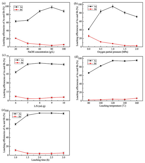 Effects of different APOL conditions on the extractions of As and Sb: (a) NaOH concentration (120 °C, L/S = 8 mL/g, 2.0 h, pO2 = 1.0 MPa, 250 rpm), (b) oxygen partial pressure ([NaOH] = 80 g/L, L/S = 8 mL/g, 2.0 h, 120 °C, 250 rpm), (c) liquid-to-solid ratio ([NaOH] = 80 g/L, 120 °C, 2.0 h, pO2 = 1.0 MPa, 250 rpm), (d) leaching temperature ([NaOH] = 80 g/L, L/S = 8 mL/g, 2.0 h, pO2 = 1.0 MPa, 250 rpm), (e) leaching time ([NaOH] = 80 g/L, L/S = 8 mL/g, 120 °C, pO2 = 1.0 MPa, 250 rpm).