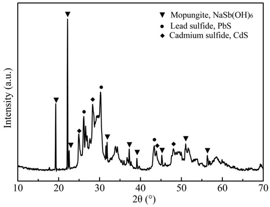 Based on the results of the condition experiments, the optimized conditions of the APOL process were established as: NaOH concentration of 80 g/L, oxygen partial pressure of 1.0 MPa, liquid-to-solid ratio of 8 mL/g, temperature of 120 °C, time of 2.0 h. The optimal experiment was repeated three times, and the results are listed in Table 3. The optimum conditions selected in this study were limited to the specific arsenic content range of raw materials, which aimed to provide theoretical guidance for the treatment of other arsenic-containing materials in the same way. It was found from Table 3 that the results of the three experiments were basically consistent. The average leaching efficiencies of arsenic, antimony, cadmium, indium, lead and zinc were 95.6%, 5.0%, 0.03%, 2.3%, 4.4% and 31.8%, respectively. In addition, the XRD pattern of the leach residue shown in Figure 6 indicated that the main mineral phases were NaSb(OH)6, lead sulfide (PbS) and cadmium sulfide (CdS), while the apparent mineral phase of As2O3 disappeared. The element contents of the leach residue under the optimized conditions are listed in Table 4. This indicated that arsenic in the leach residue was less than 5.0%, and most arsenic entered the leachate, while antimony, cadmium, lead, zinc and other metals were enriched in different degrees in the leach residue. The leach residue could be returned to a pyrometallurgical process to recover valuable elements. The analytical results confirmed that the selective extraction of arsenic was achieved by the APOL process.