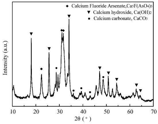 Therefore, the effect of CO2 on the causticization process was investigated firstly before the condition experiments. The causticization process was carried out in a water bath in air under the following conditions: temperature of 80 °C, time of 2.0 h, Ca/As of 3.0. The XRD pattern of the precipitate shown in Figure 7 indicates that the main mineral phases were calcium hydroxide (Ca(OH)2), calcium carbonate (CaCO3) and calcium fluoride arsenate (Ca5F(AsO4)3). There is no apparent mineral phase of calcium arsenate identified from the precipitate. There is no doubt that the presence of CO2 reduces the efficiency of causticization and the purity of the final product. Hence, the effects of different parameters including CaO dosage, temperature and time on the causticization process were investigated in a vacuum to avoid the negative influence of CO2.